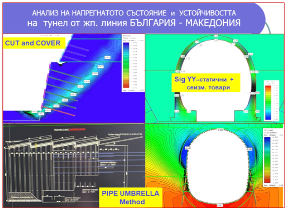 Tunnel HEMUS, km 119.00, Tunnel Bulgaria-Macedonia, Tunnel Botevgrad-Mezdra, Tunnels RAKITNA and STARA KRESNA from Highway STRUMA, Gorna Arda headrace tunnels, Topli dol and Echemishka (highway “HEMUS”); Tunnel for the Metro under Dr. Tzankov Street Sofia, Tunnel Dupnitza, Tunnels Malo and Goliamo Buchino (highway “LULIN”).
